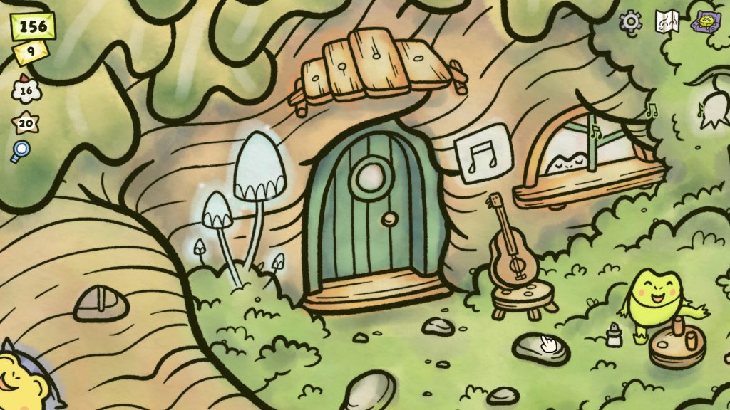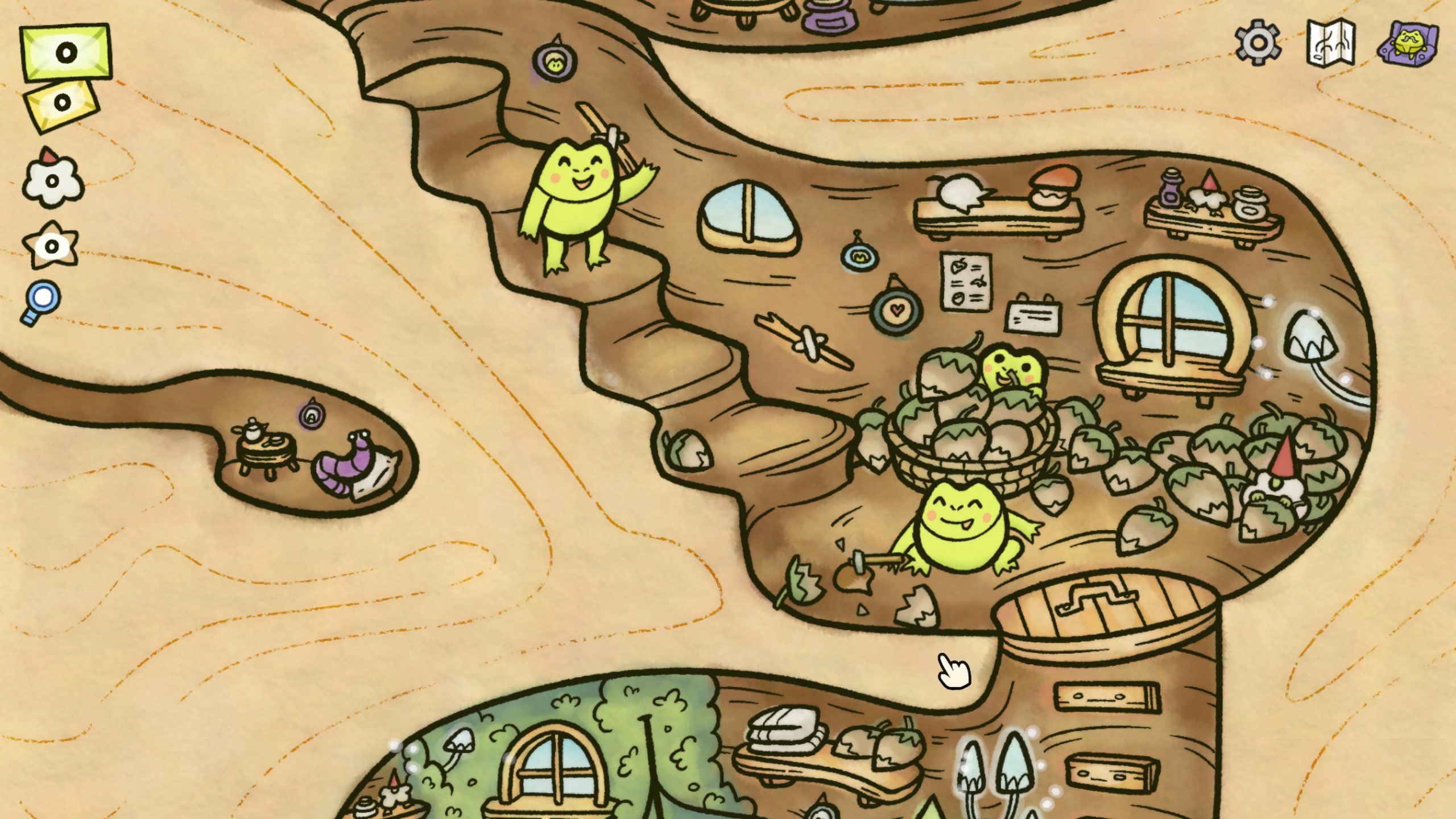 You will be finding items to collect. On the main level (Moss Glade) of the game you will see a tree that is in water surrounded by Lilly pads. This will be the area where the majority of items will be found. On the tree there are doors that will lead to smaller levels that have a certain amount of items to be found. Use the pictures below to find all the items. For some of the items (in the pictures below) there may be an open box, window, bags, etc. and these were where the frogs, toads, secrets, mice, or bugs were found. You will also need to paint empty canvases, help the seedlings grow, try the strawberry jams, and eat the strawberry pieces by clicking on them throughout all the levels.